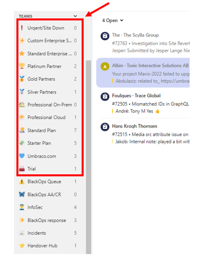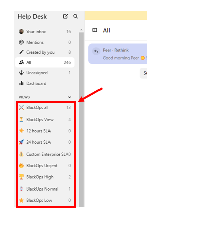 Mentions (highlighted with a purple rectangle) - if somebody mentioned you in a conversation, you can see this here; It is important to keep an eye on this, especially when you have an ongoing BlackOps ticket.