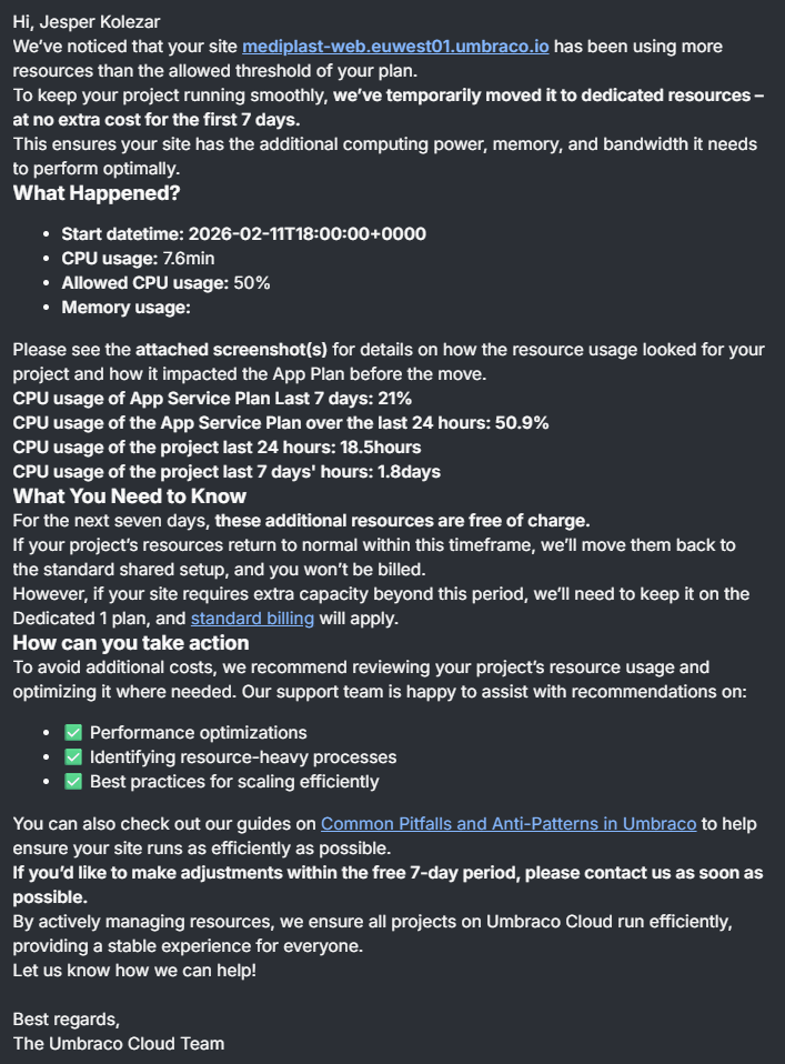 Above is an example of an automated message, sent to a customer who was using too many resources from a shared app pool.