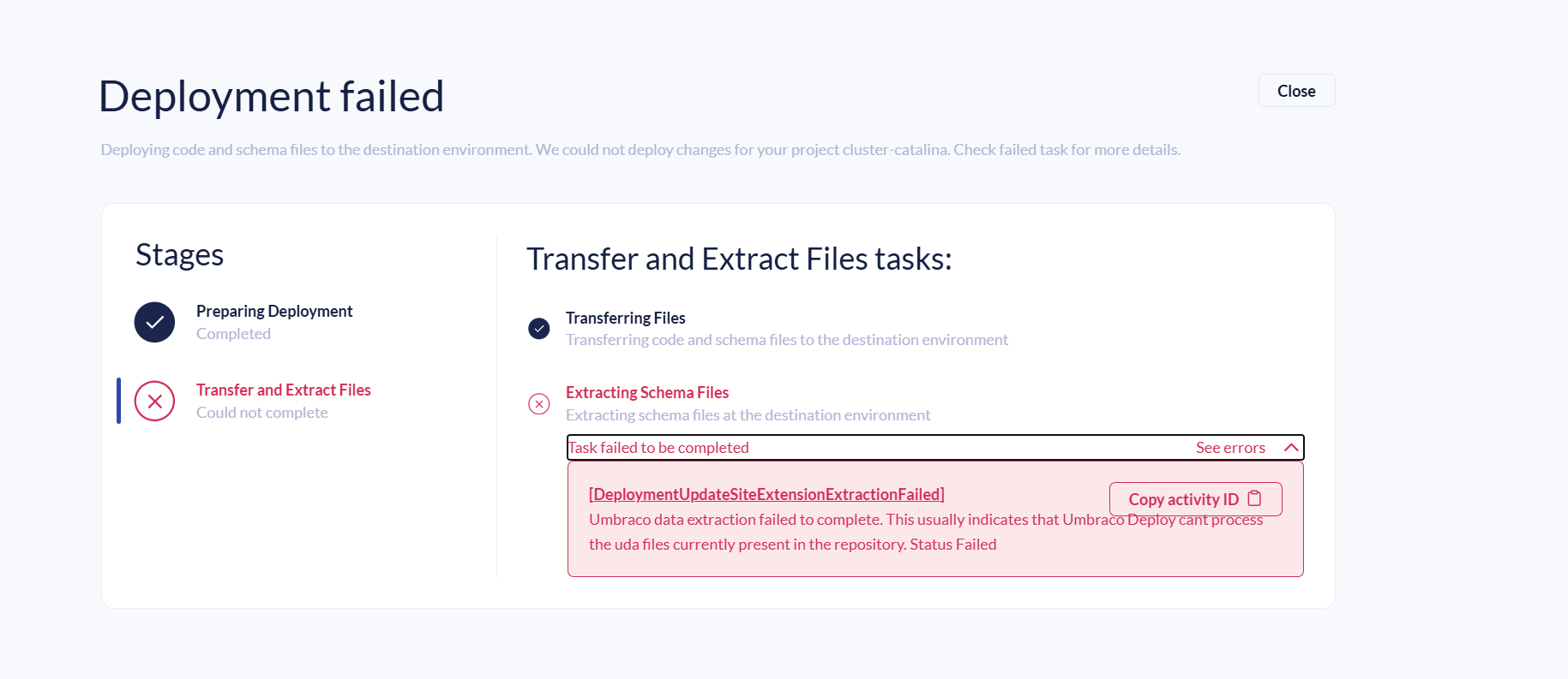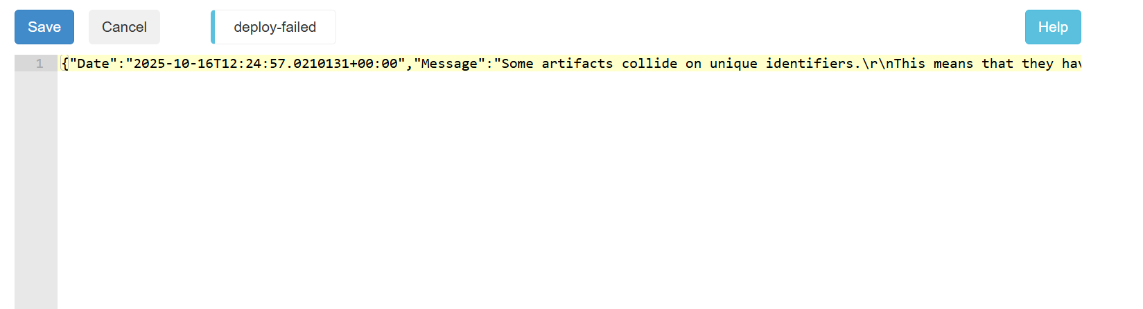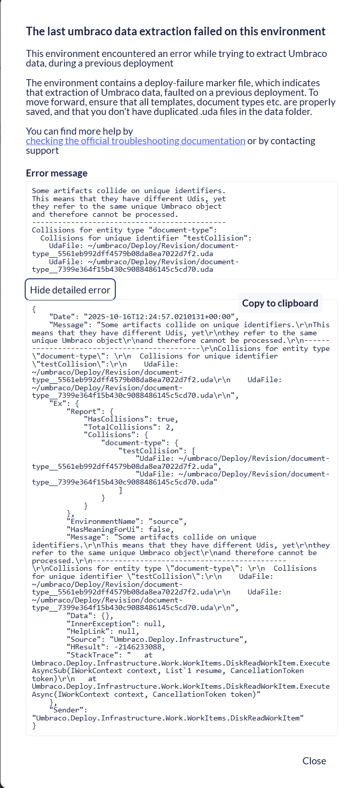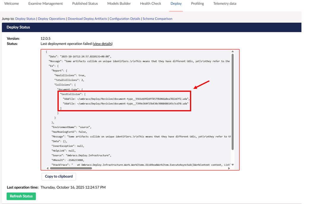 b222...When merging UDAs, Umbraco Deploy detects two “Article” types with different identifiers → collision error.